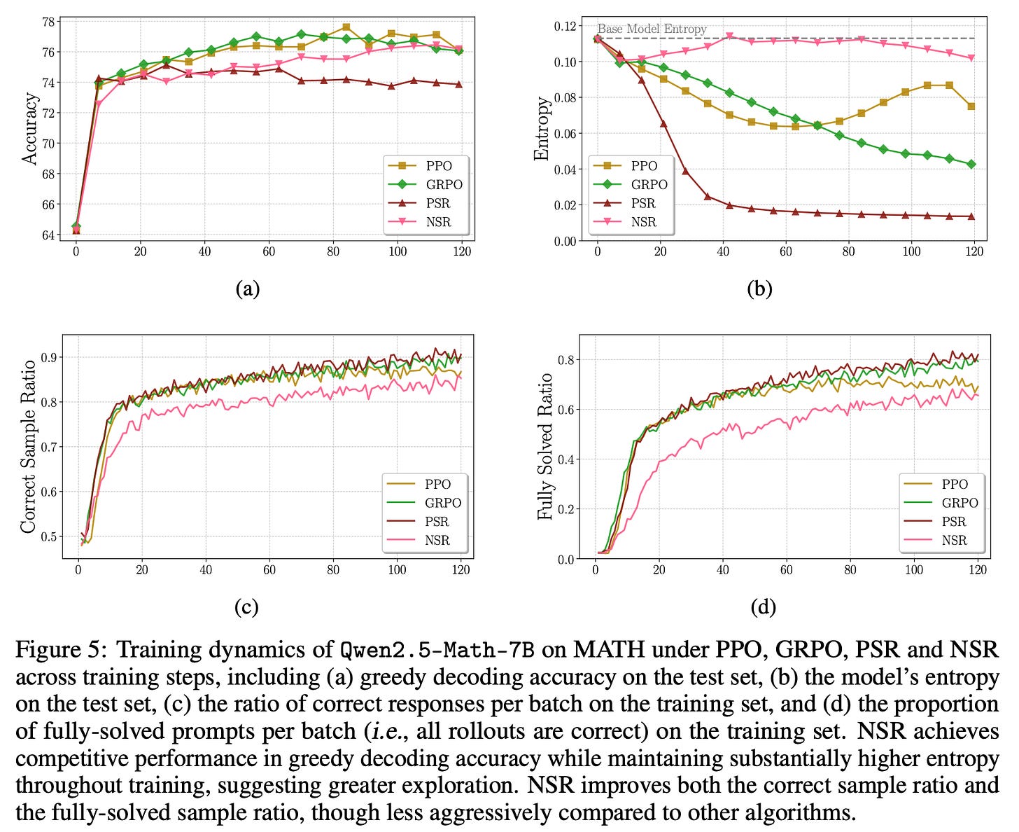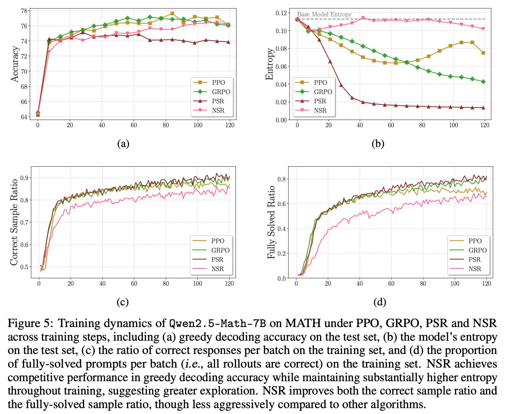 Figure 5 below shows that Positive Sample Reinforcement (PSR, on-policy RL on positive examples only) collapses the entropy and leads only to a small increase in accuracy, while Negative Sample Reinforcement (NSR, on-policy RL on negative examples only) avoids the entropy collapse and reaches the accuracy levels similar to PPO/GRPO. The authors make an analogy PSR being Exploitation and NSR being Exploration. PSR reinforces discovered positive behaviors, while NSR shifts the probability away from discovered negative behaviors and the allocation of this probability to other outputs causes some exploration. An important caveat is that NSR redistributes probability within the support of the policy, so the extent of exploration is fairly limited.