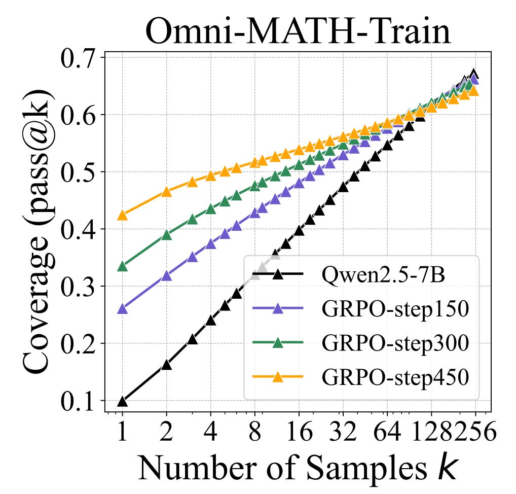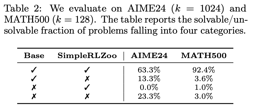 This aligns with findings from “Does Reinforcement Learning Really Incentivize Reasoning Capacity in LLMs Beyond the Base Model?”. This paper suggests that RL doesn’t teach the model new reasoning behaviors. Instead, it prioritizes useful patterns that already exist after pre-training (via positive gradients) and prunes incorrect ones (via negative gradients). Figure 1 illustrate this - RLVR training increases pass@1 rates, but reduces pass@k rates for large k>64. Additionally, Table 2 shows that for AIME24 there isn’t a single problem which the base model couldn’t solve (with a large number of samples k=1024), but the post-RLVR model can solve. Similarly, for MATH500 the post-RLVR model gains the ability to solve only 1% of problems which couldn’t be solved by the base model, but at the same time it loses the ability to solve 3.6% of problems which the pre-trained model could solve.