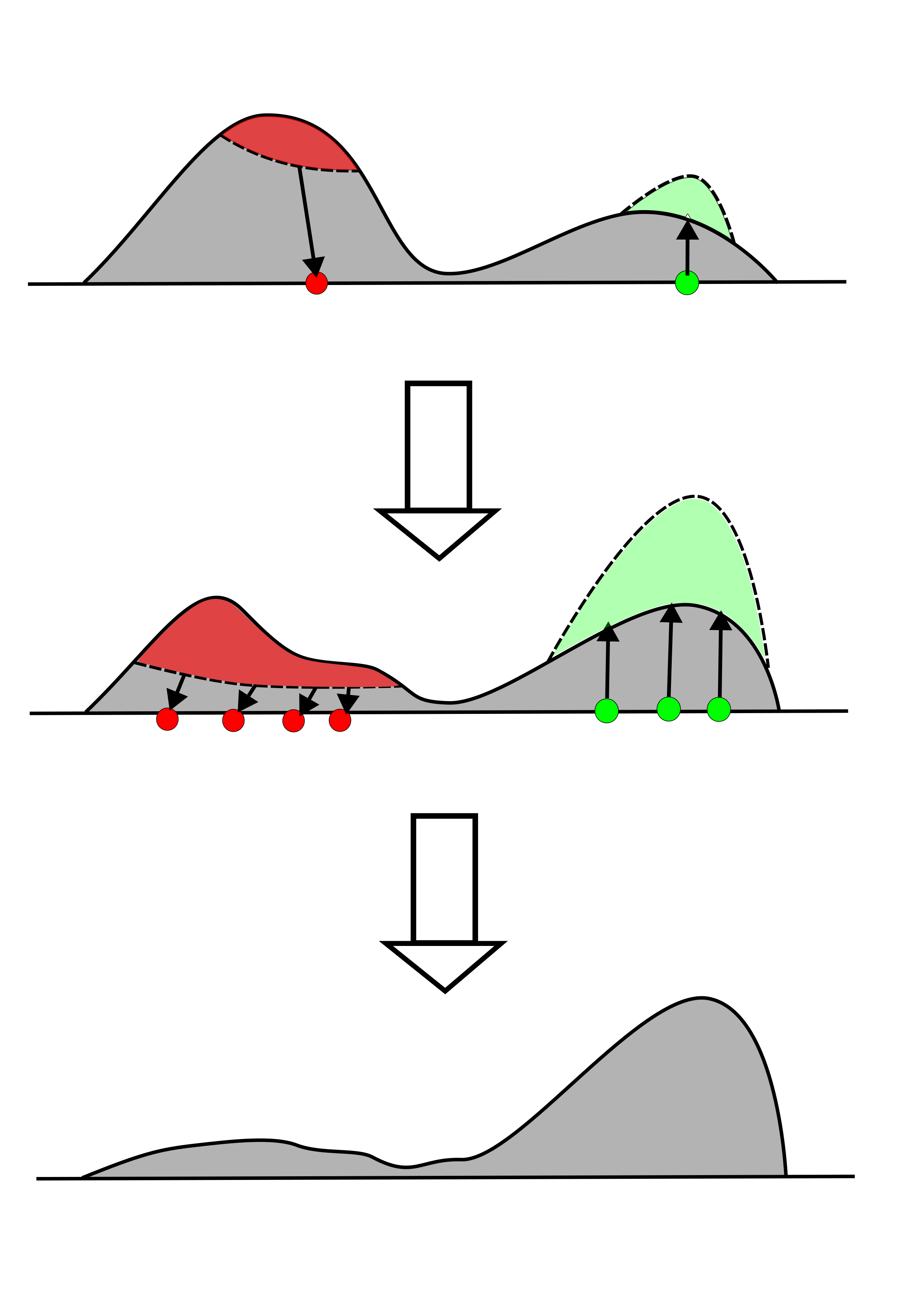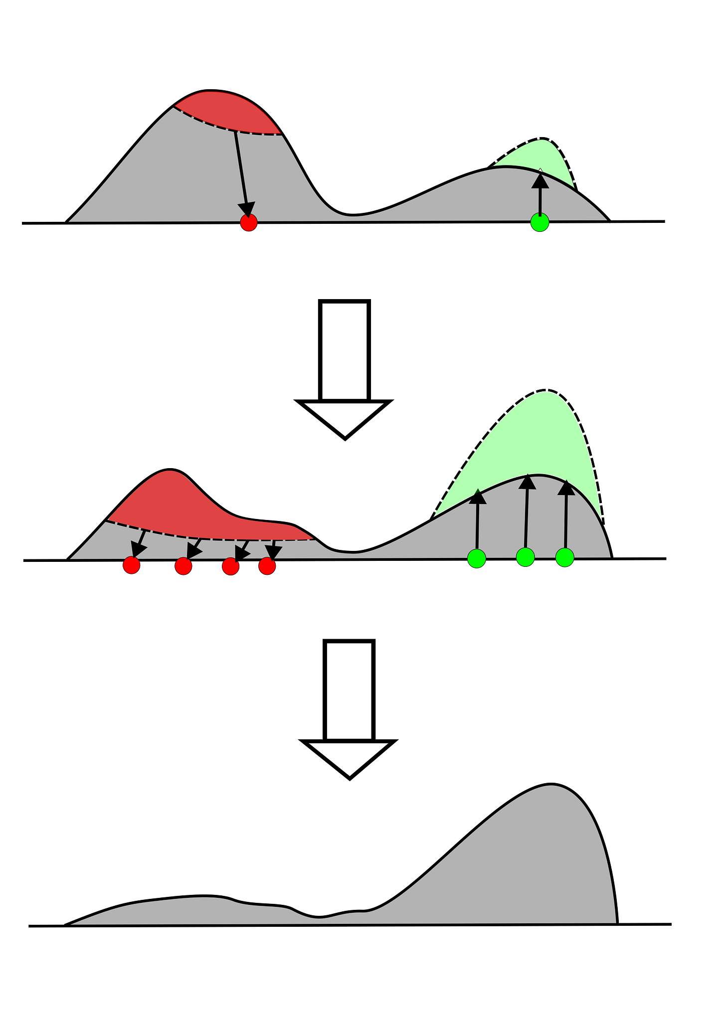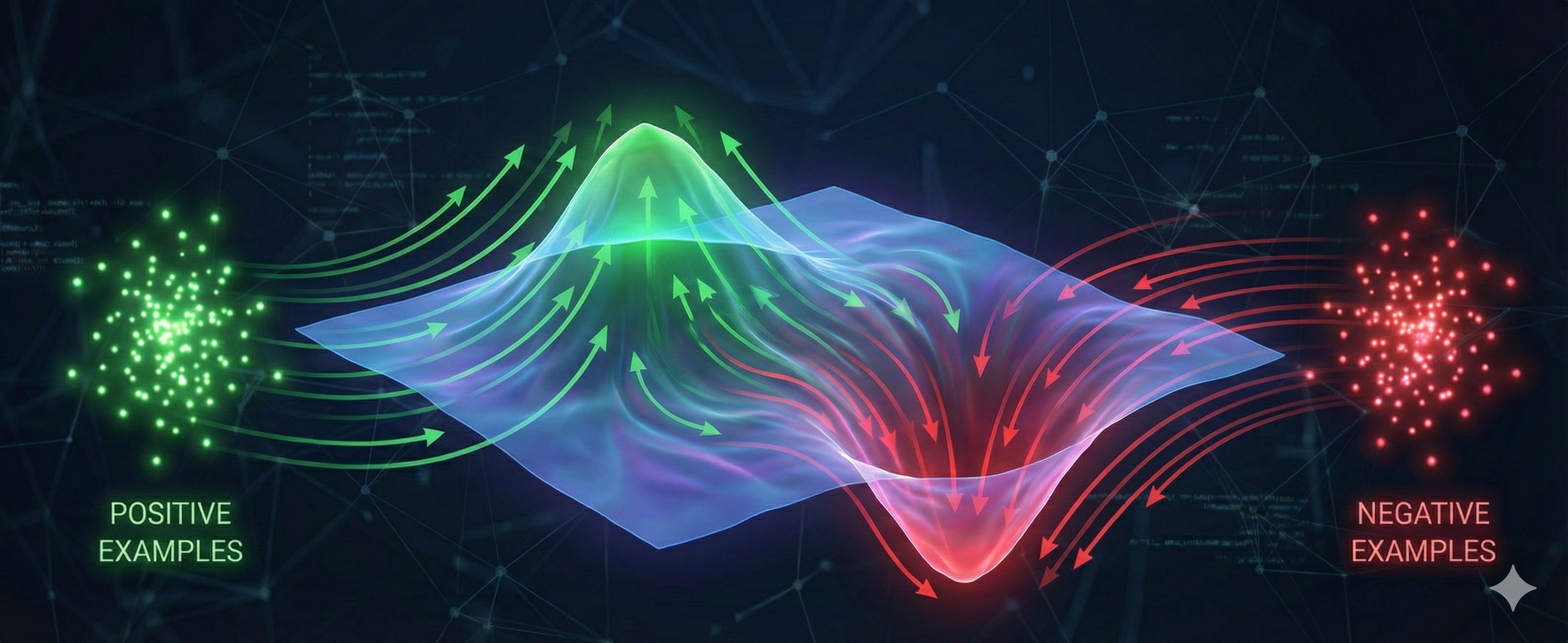 The figure below illustrates the effects of positive (green) and negative (red) on-policy examples. The positive examples locally “absorb” the probability density, while the negative examples “expel” the density.